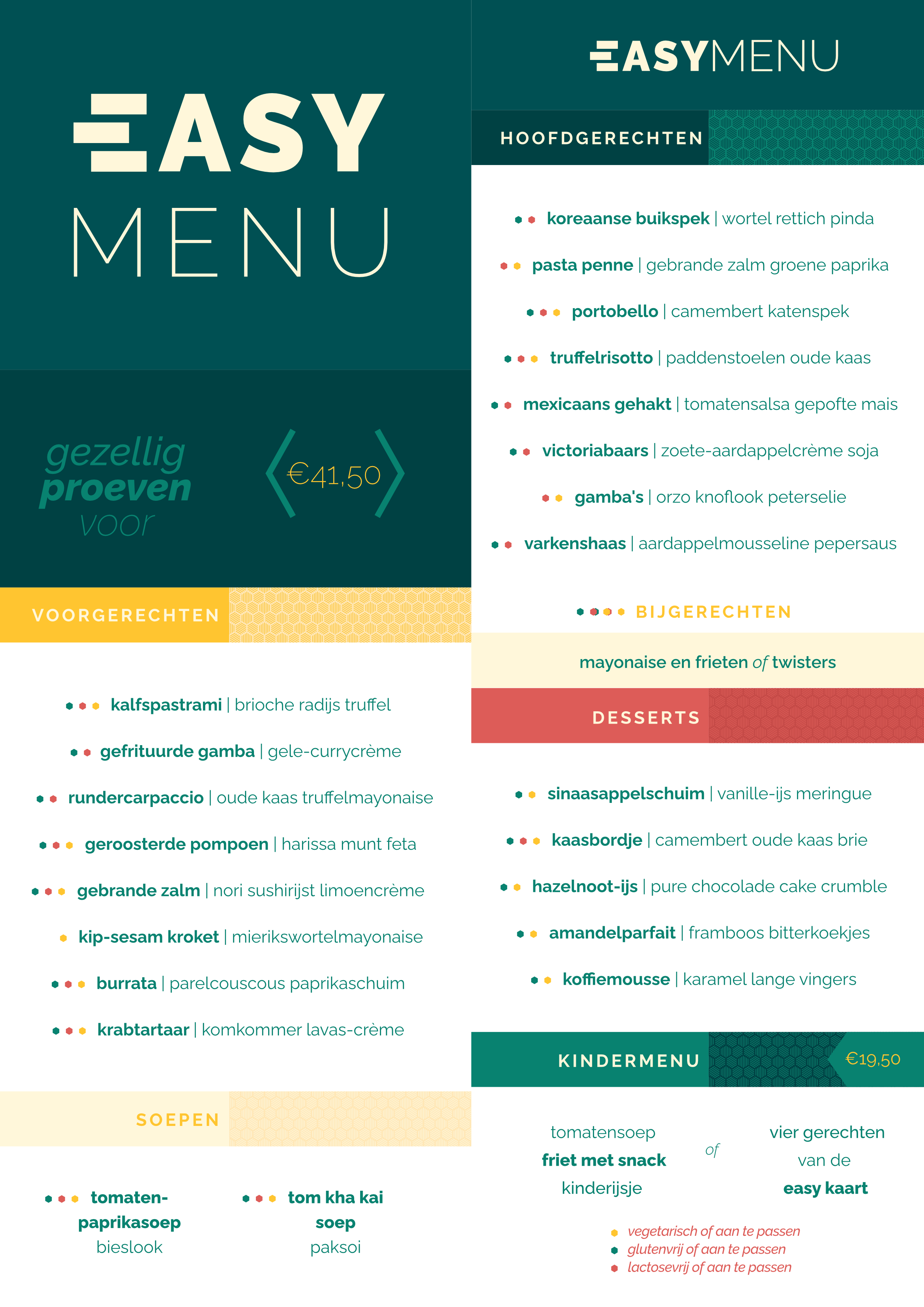 Bij Easy kun je eindeloos proeven. Voor een vaste prijs van €41,50 bestel je een avond lang wat je wilt van onze menukaart (ex. drankjes).